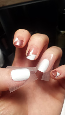 Then I used tape as a guide and painted the rose gold on the thumb and 4th finger nails to make the bigger pointed triangles resembling the cut out part from the dress!